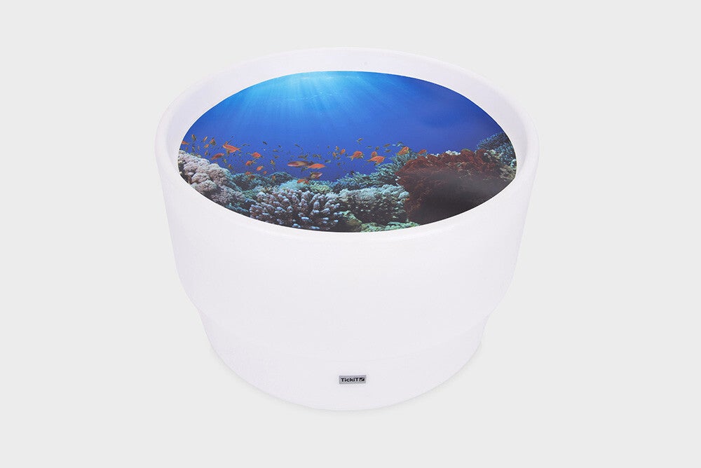 Mood Discovery Table + 3 play mats- Table size: 45cm high x 69cm diameter. Depth of discovery area is 6cm. Play mat size: 62.5cm diameter.